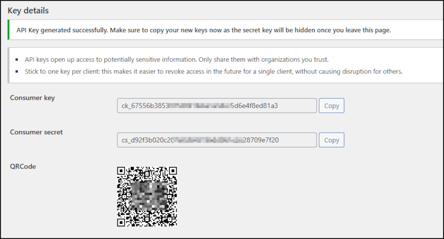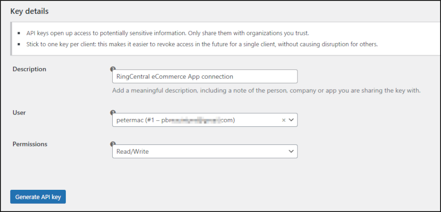 The first thing to do is to create a WooCommerce REST API Keys set for use within this
